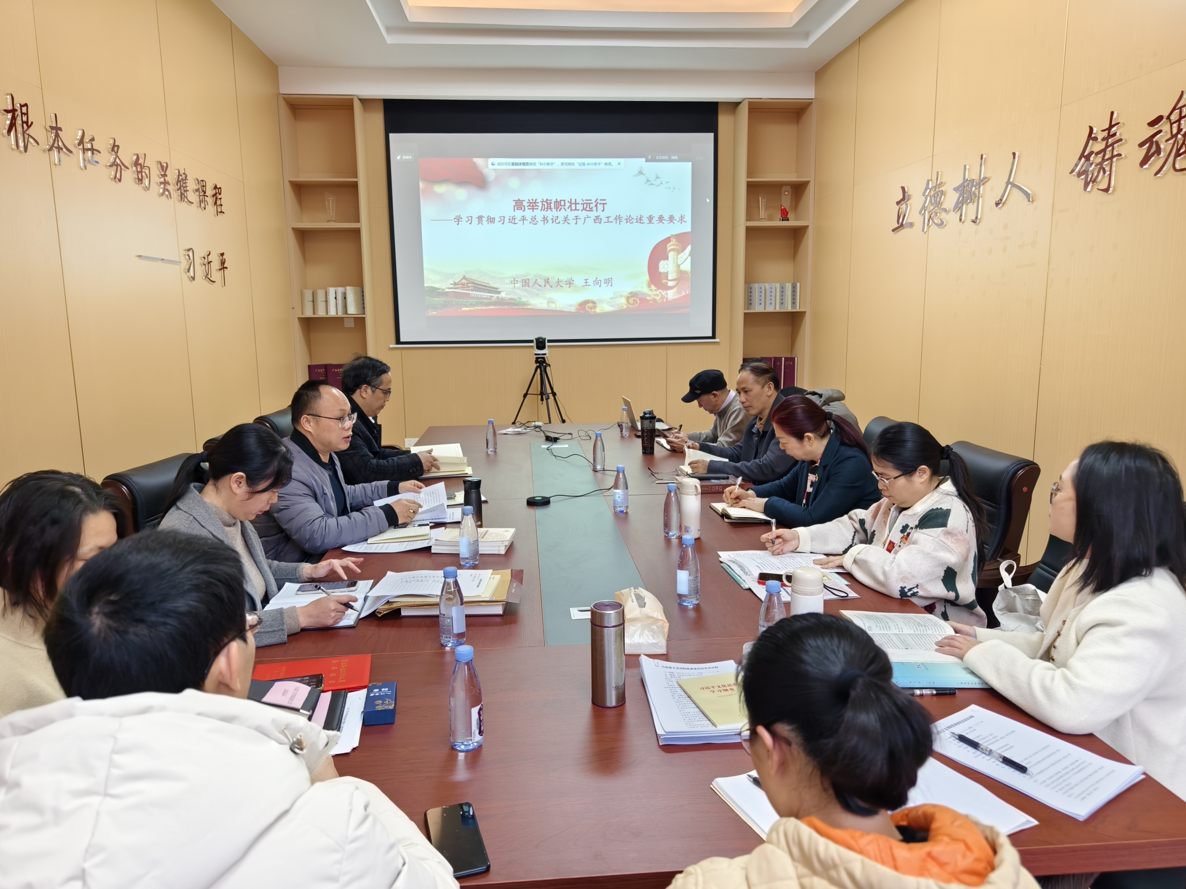 会上,王向明教授为与会人员作了《高举旗帜壮远行——学习贯彻习近平总书记关于广西工作论述的重要要求》的专题辅导。王向明教授以视频《壮美之路》为切入点,阐释了广西是“一带一路”有机衔接的重要门户、要做“高质量发展”的排头兵、要保护好生态环境、要做民族团结示范区、要以改革创新推动教育发展等方面的内容,对公司进一步提高医公司校suncitygroup太阳集团高质量发展,主动融入服务“一区两地一园一通道”建设提供了建设性指导。