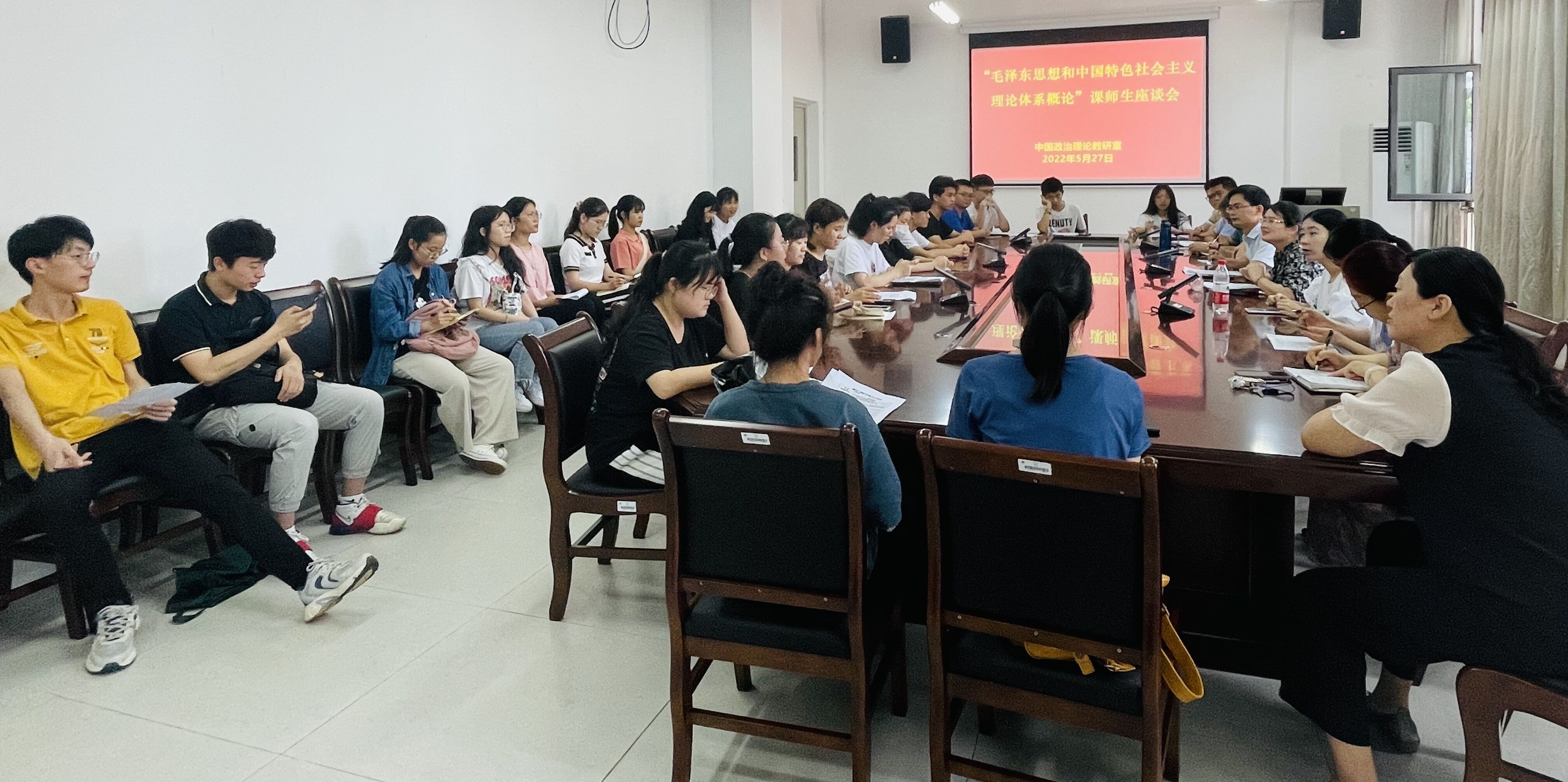 为了贯彻“以生为本”的教学理念,全面准确了解员工对课程教学活动的感受和评价,进一步提升教师队伍的公司产品能力,稳步提高课程教学质量,suncitygroup太阳集团中国政治理论教研室于5月27日在武鸣校区博雅楼A9-108会议室召开《毛泽东思想和中国特色社会主义理论体系概论》(下面简称《概论》)课师生座谈会。参加本次活动的有中国政治理论教研室教师以及2022春学期武鸣校区《概论》课各班员工代表。