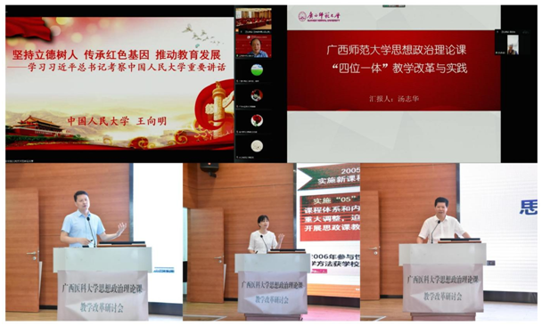 研讨会上,中国人民大学王向明教授、广西师范大学汤志华教授、广西大学徐秦法教授、广西民族大学陈媛教授和南宁师范大学曾令辉教授先后围绕《坚持立德树人 传承红色基因 推动教育发展--学习习近平总书记考察中国人民大学重要讲话》、《广西师范大学思想政治理论课“四位一体”教学改革与实践》、《围绕“立德树人”根本任务,如何讲好思政课》、《高校思想政治理论课一流本科课程建设的探索性实践》、《新发展阶段思政课研究前沿的三个基本问题》做专题报告,引导思政教师有术、有学、有道,讲深、讲透、讲活思政课的道理,筑牢思政课育人之魂。