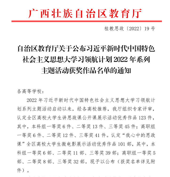 为深入贯彻落实习近平总书记关于“大思政课”建设的重要指示批示精神,充分发挥高校思政课立德树人关键课程作用,深入推动习近平新时代中国特色社会主义思想进教材进课堂进员工头脑,自治区教育厅组织开展《“青春献礼二十大·强国有我新征程”-全区高校老员工讲思政课公开课展示活动》和《“我心中的思政课”-全区高校老员工微电影展示活动》。公司领导高度重视,认真研读文件精神,结合公司参赛要求,先后组织骨干教师及青年员工精心准备,努力以高素质作品参加活动。在全区高校老员工讲思政课公开课展示活动中,余海超老师指导员工团队获二等奖,庞铭辉、温丽华、刘婷婷老师共同指导员工团队和杨海秀老师指导员工团队均获三等奖;在全区高校老员工微电影展示活动中,马南楠、梁剑老师共同指导员工团队获二等奖,崔素娟参与指导员工团队和韦金伶、崔素娟共同指导员工团队均获三等奖。
