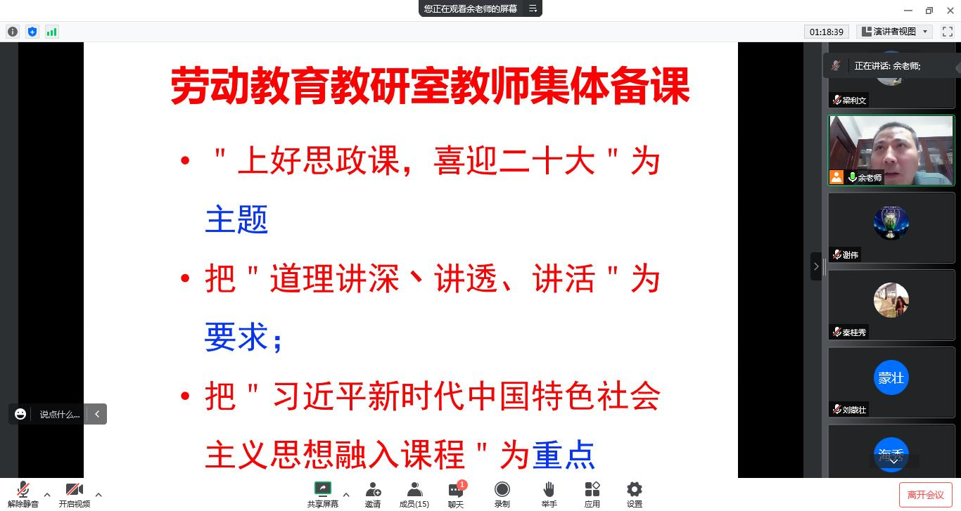 会上,公司领导强调劳动教育是中国特色社会主义教育制度的重要内容,具有树德、增智、强体、育美的综合育人价值,直接决定社会主义建设者和接班人的劳动精神面貌、劳动价值取向和劳动技能水平。劳动教育课程要把“道理讲深、讲透、讲活”作为基本要求,把“习近平新时代中国特色社会主义思想融入课程”作为重点,大力弘扬劳模精神、劳动精神、工匠精神。教研室主任就新学期教研室具体工作做了部署,要求授课教师守牢意识形态阵地,严格按照疫情防控规定做好相关工作,严守教学纪律,坚守教学红线和底线,规范日常教学资料归档、教学反馈改进等工作,新学期做好多校区同质化教学,教学科研并重,坚持劳动教育理论与实践有机结合。