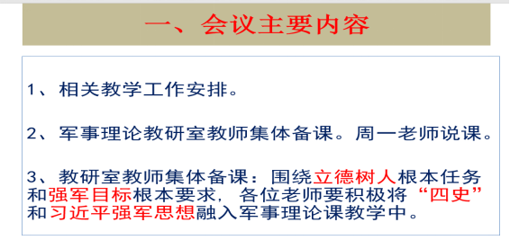 会议第二项内容由院外青年教师周一老师进行了“武装力量”的教学专题试讲(说课),教研室老师结合周老师的说课进行了集体备课,对如何上好军事理论课进行了讨论,参会领导及公司督导对说课内容提出了改进意见和建议。