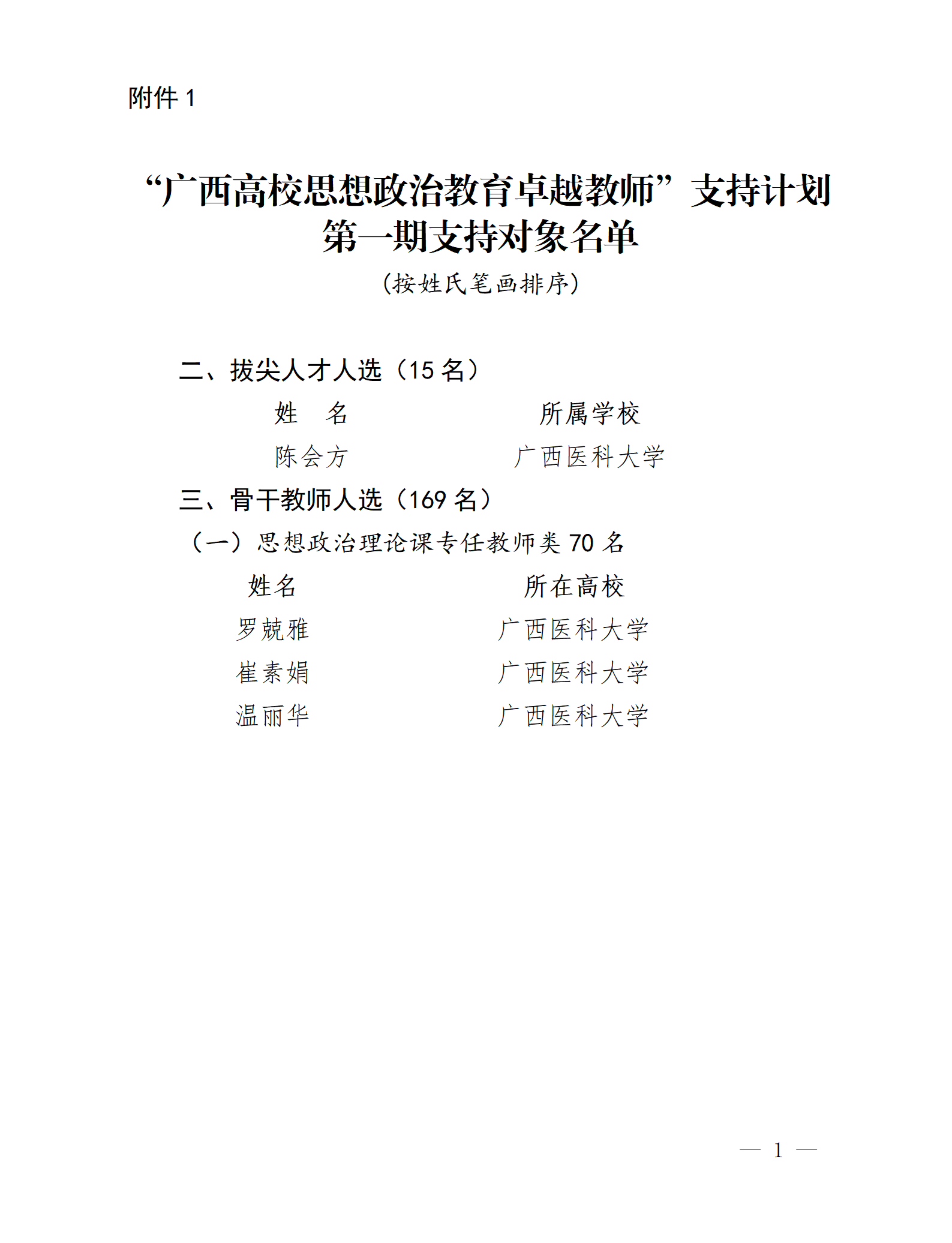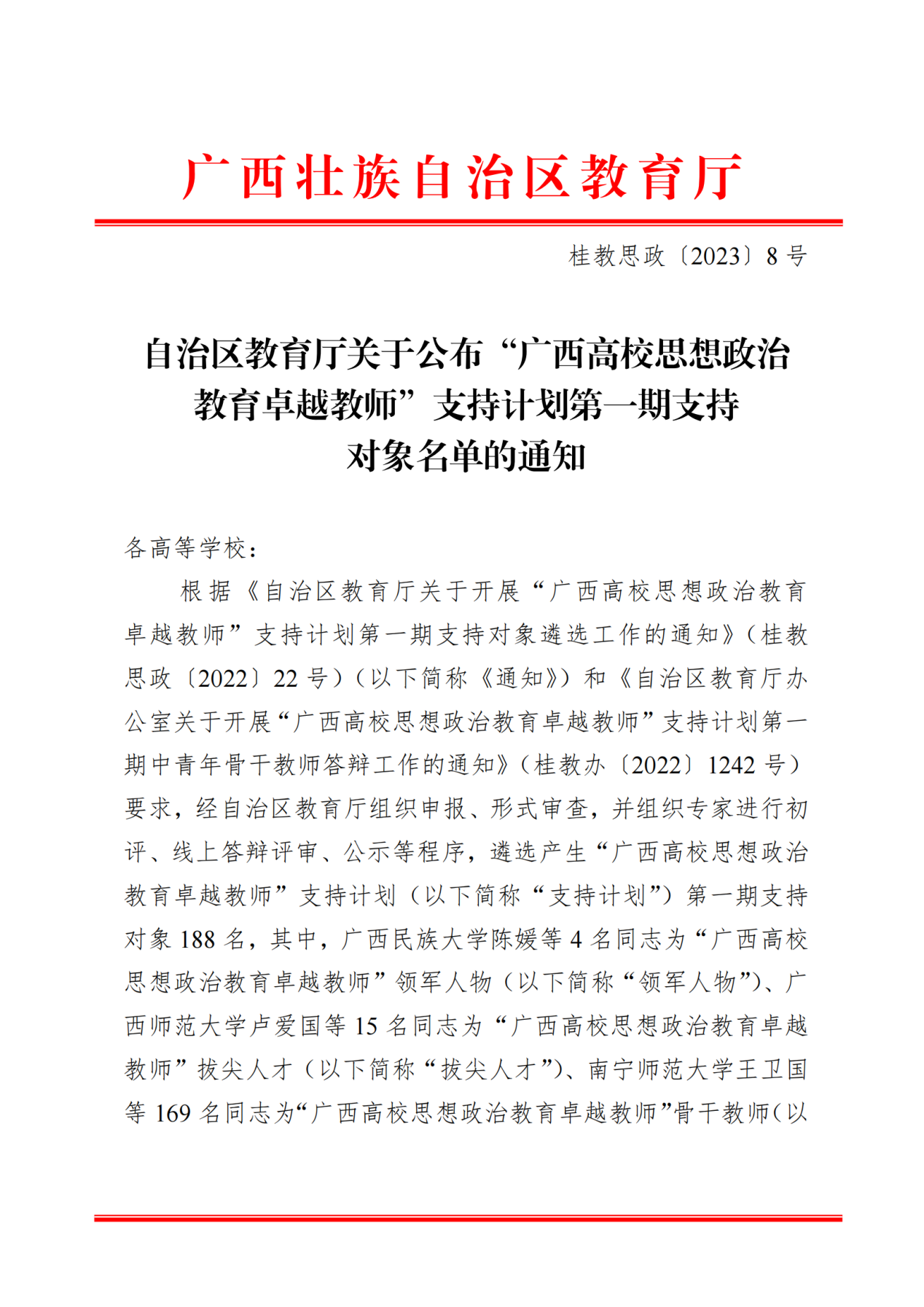 近日,自治区党委教育工委、自治区教育厅公布“广西高校思想政治教育卓越教师”支持计划第一期支持对象,公司suncitygroup太阳集团共有4位教师入选,分别是:陈会方教授被认定为“广西高校思想政治教育卓越教师”拔尖人才,罗兢雅副教授、崔素娟副教授、温丽华副教授被认定为“广西高校思想政治教育卓越教师”骨干教师(专任教师)。
