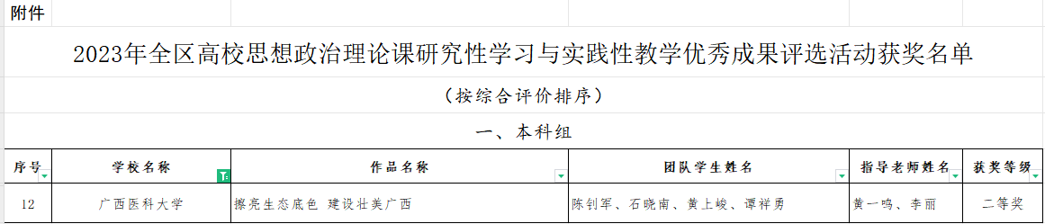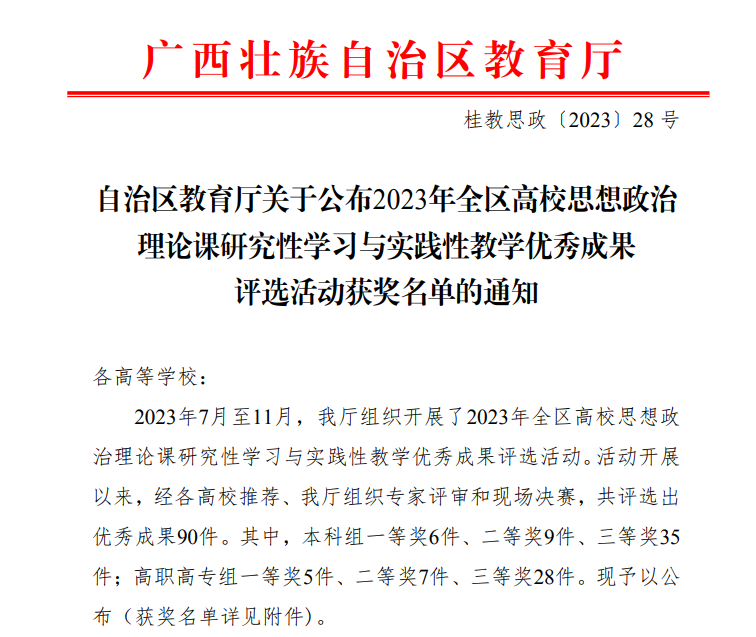 近日,自治区教育厅公布2023年全区高校思想政治理论课研究性学习与实践性教学优秀成果评选活动获奖名单。公司suncitygroup太阳集团黄一鸣、李丽两位老师指导的员工团队成果《擦亮生态底色建设壮美广西》(团队成员:陈钊军、石晓南、黄上峻、谭祥勇)荣获二等奖。