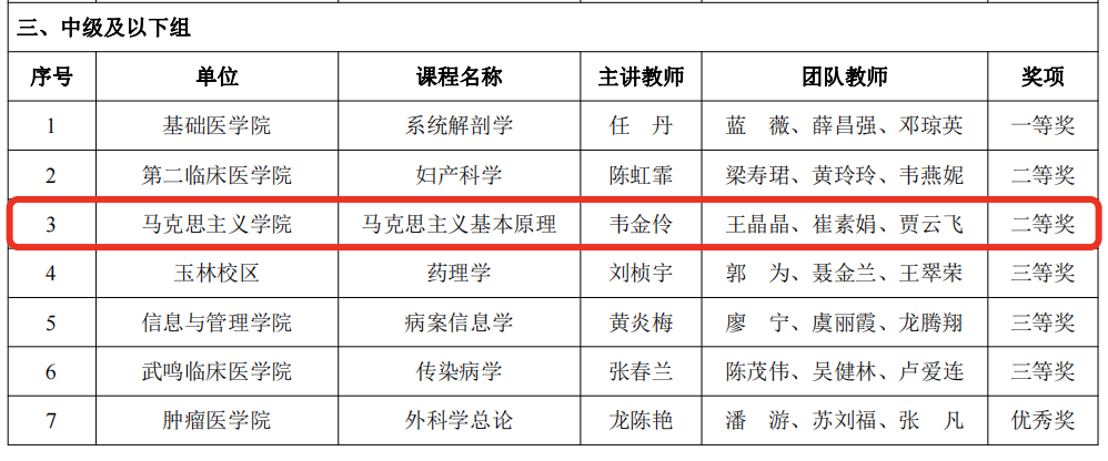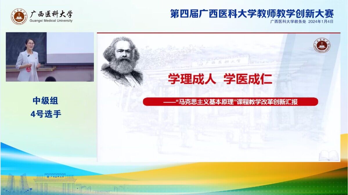 本次比赛设正高组、副高组、中级及以下组、课程思政组,共有28支教师队伍参加大赛。经过网络评审和现场评审,共评出一等奖4名、二等奖6名、三等奖10名、优秀奖8名。韦金伶教师团队针对课程存在的“无趣”、“无用”、“无效”等困惑,立足“德医交融”,对课程进行了理念创新、内容创新及方法创新,最终,在大赛中脱颖而出,喜获中级及以下组二等奖。