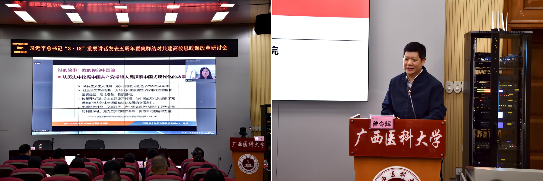 研讨会上,广西民族大学陈媛教授、南宁师范大学曾令辉教授分别作教学经验分享及科研经验分享。陈媛教授以“讲好中国式现代化故事的教学策略”为主题,围绕为什么和怎样讲好中国式现代化故事作了精彩展示。曾令辉教授以“新时代思政课教师研究力提升的实践路径”为主题,强调教学与科研要统筹协调、一体推进,并着重讲解什么是思政课教师研究力、研究力构成要素、研究力提升路径。