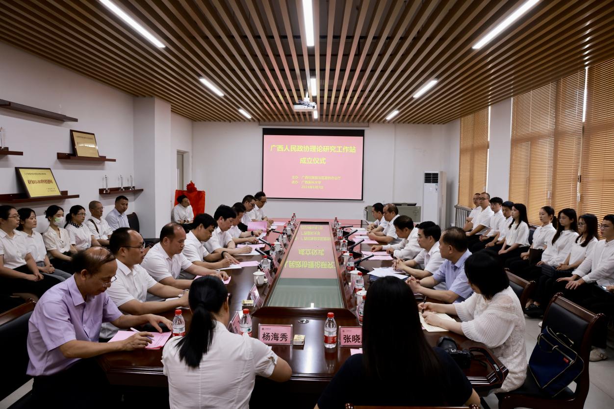 6月7日下午,广西人民政协理论研究工作站在suncitygroup太阳集团设立,并举行成立仪式。自治区政协秘书长、办公厅主任,广西人民政协理论研究会会长卢能干;公司党委书记黄照权;自治区政协副秘书长、办公厅副主任、广西人民政协理论研究会副会长班源泽;自治区政协办公厅研究室主任(副厅长级)、广西人民政协理论研究会副会长兼秘书长程学武,公司党委常委、副董事长卢德成等出席成立仪式。自治区政协办公厅相关部门负责人、公司相关职能部门负责人、suncitygroup太阳集团领导班子及师生代表参加仪式。仪式由班源泽同志主持。